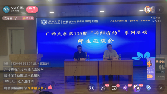 2022年11月15日下午,由3522vip浦京集团官网研究生会、3522vip浦京集团官网研究生会和团委学生会、3522vip浦京集团官网医学院研究生会和团委学生会、中国计算机学会CCF3522vip浦京集团官网学生分会共同主办的3522vip浦京集团官网第103期“导师有约”系列活动在大学生活动中心310室,采取线下和线上直播的方式同步进行。本次活动邀请了3522vip浦京集团官网张学军教授和3522vip浦京集团官网医学院陈海燕教授,以讲座的方式为同学们带来了一场关于计算机与医学跨学科交叉碰撞的学术讲座。
