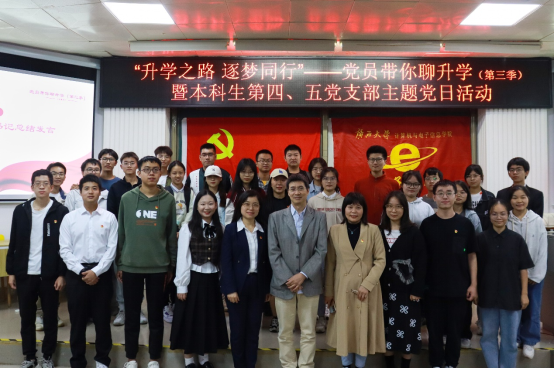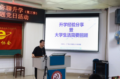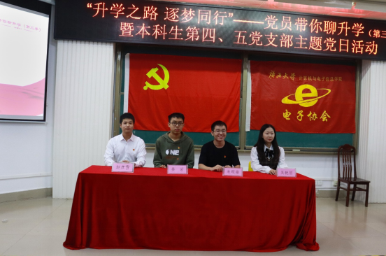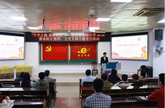 2022年11月26日晚上,由3522vip浦京集团官网本科生第四党支部主办,联合本科生第五党支部、学院团委电子创新协会共同承办的主题为“升学之路 逐梦同行”——党员带你聊升学(第三季)升学经验分享会在学院214报告厅举行。学院党委副书记邓珍琪老师,学院学生电子创新协会指导老师、电子信息工程系主任张学军教授,本科生第四党支部书记、学院团委副书记杨洋老师,本科生第五党支部书记、学院专职组织员薛金凤老师,学院专职辅导员庞承业老师出席会议。本次升学经验分享会由学院电子创新协会2021级本科生蔡其峰同学主持,通信工程191班朱硕隆同志、通信工程182班吴艳丽同志、网络工程192班姜岩同志、通信工程171班赵彦雪同志为本次分享会主讲人。