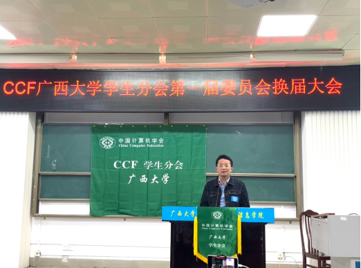吕品老师首先致辞,他表达对现任执委工作的肯定,并鼓励分会学生会员积极利用好中国计算机学会CCF的丰富资源,不断提高专业水平。随后,分会现任主席涂欢同学就过去一年分会在学术科技服务、升学就业服务及素质技能提升三方面做工作报告。