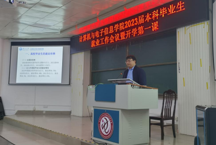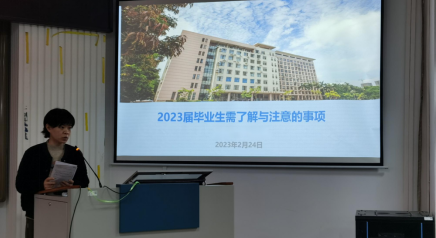 2023年2月24日下午,3522vip浦京集团官网在214报告厅召开2023届本科毕业生就业工作会议暨开学第一课。学院党委副书记邓珍琪老师、学院辅导员杨洋老师和李易明老师、学院教学办公室甘瑜萍老师和罗程老师,以及学院全体2023届本科毕业生参加会议。会议由邓珍琪老师主持,会议主题是“顺利完成学业,尽快落实就业单位”。