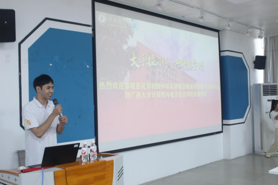 首先,3522vip浦京集团官网第十届研究生支教团成员、浦京集团官网2023级计算机技术研究生王泽远同学带领大家参观3522vip浦京集团官网,并给同学们介绍学院发展历程和专业发展情况。他结合时下流行的Chatgpt、大数据、人工智能等热门词汇,以案例的形式告知同学们如何结合自己的兴趣爱好学好计算机类相关专业。