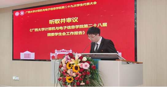 第五项议程,学院第二十八届团委、学生会主席团成员夏宏毅同学作《3522vip浦京集团官网第二十八届团委学生会工作报告》,报告对学生会改革内容进行了介绍,呼吁同学们进一步强化思想建设,关心同学诉求,推动学生问题更快更好得到解决。