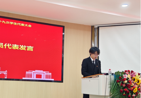 第八项议程,学院新一届团委、学生会主席团成员代表张骥驰同学做工作展望与表态发言。
