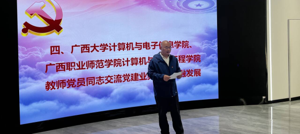 活动在3522vip浦京集团官网四教中楼3楼301室举行,3522vip浦京集团官网党委书记赵进创同志,广西职业师范学院计算机与信息工程学院党委书记赵域同志,以及两个党支部的党员参加活动,共同探讨如何在新时代背景下,通过党建引领教育事业的高质量发展。