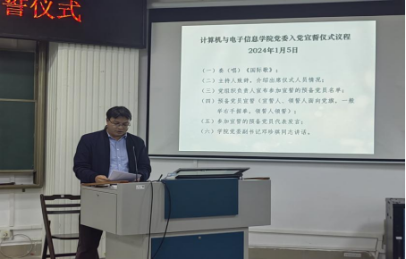 2024年1月5日,3522vip浦京集团官网党委在学院214报告厅举行入党宣誓仪式。本次会议由研究生第一党支部副书记韦惜旖同志主持,3522vip浦京集团官网党委副书记邓珍琪同志、专职组织员薛金凤同志、研究生第一党支部支委姚露姗同志以及新发展的54名党员同志参加会议。