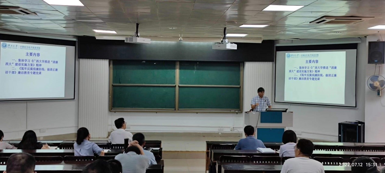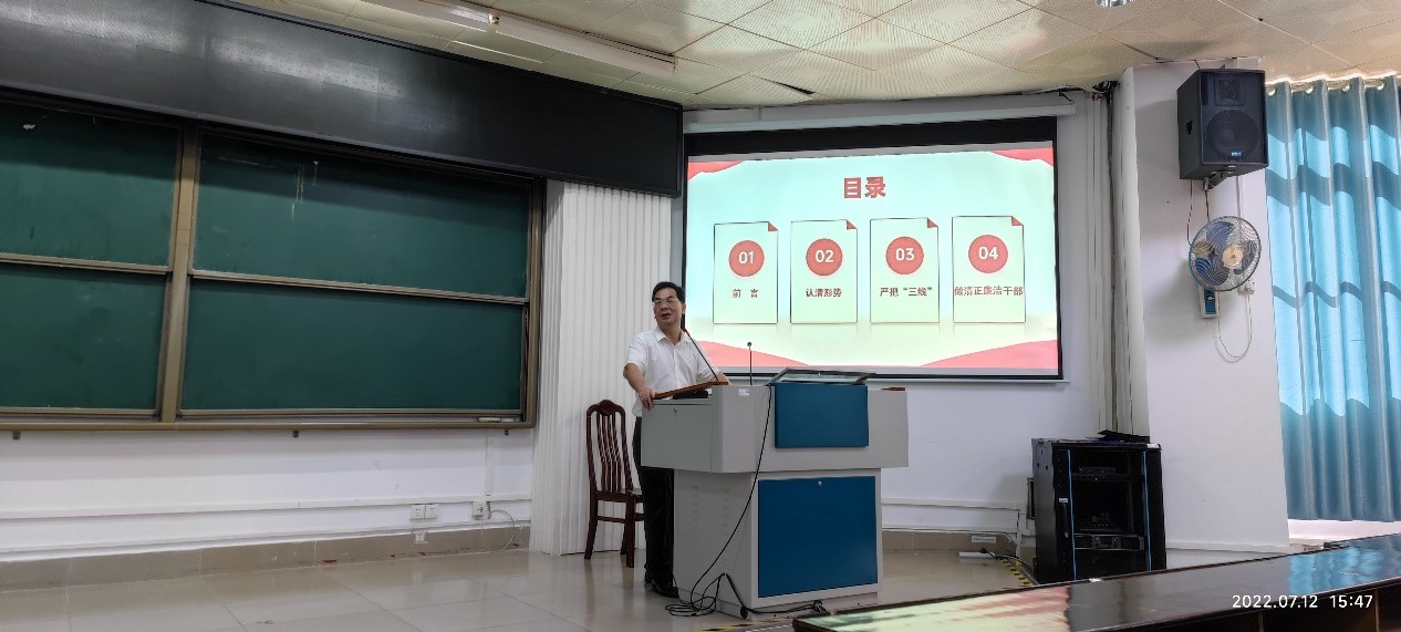 本次大会首先由学院党委副书记、纪委书记邓珍琪同志带领全体教职工共同学习《3522vip浦京集团官网推进“清廉西大”建设实施方案》精神;然后邓珍琪同志为全体教职工作题为《筑牢反腐倡廉防线,做清正廉洁干部》廉洁教育专题党课;最后学院党委书记钟诚同志强调要求全体教职工必须高度重视廉洁教育,要将廉洁廉政教育与课程思政有机结合,做到让廉洁文化深入师生心中、廉洁理念成为共识、廉洁自律意识时刻牢记。