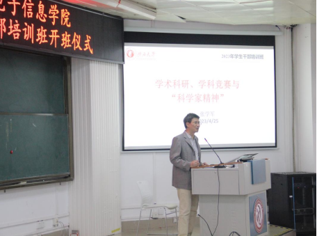 接着,张学军老师通过自身经历,讲述了自己对“科学家精神”的理解。同时,张老师介绍了学生参与各类竞赛和获得的成就等情况,鼓励同学们多交流、跨学院合作,希望学生干部引导更多同学投入到科研和学科专业竞赛中,提升学生综合素质,弘扬科学家精神。