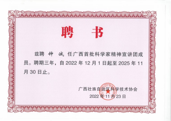 最近,广西壮族自治区科学技术协会颁发聘书,聘任浦京集团官网钟诚教授为广西首批科学家精神宣讲团成员,聘期三年。广西首批科学家精神宣讲团成员积极参加科学家精神宣讲工作,大力学习宣传贯彻习近平新时代中国特色社会主义思想、党的二十大精神,大力宣传新时代胸怀祖国、服务人民、勇攀高峰、敢为人先、追求真理、严谨治学、淡泊名利、潜心研究、集智攻关、团结协作、甘为人梯、奖掖后学的科学家精神。